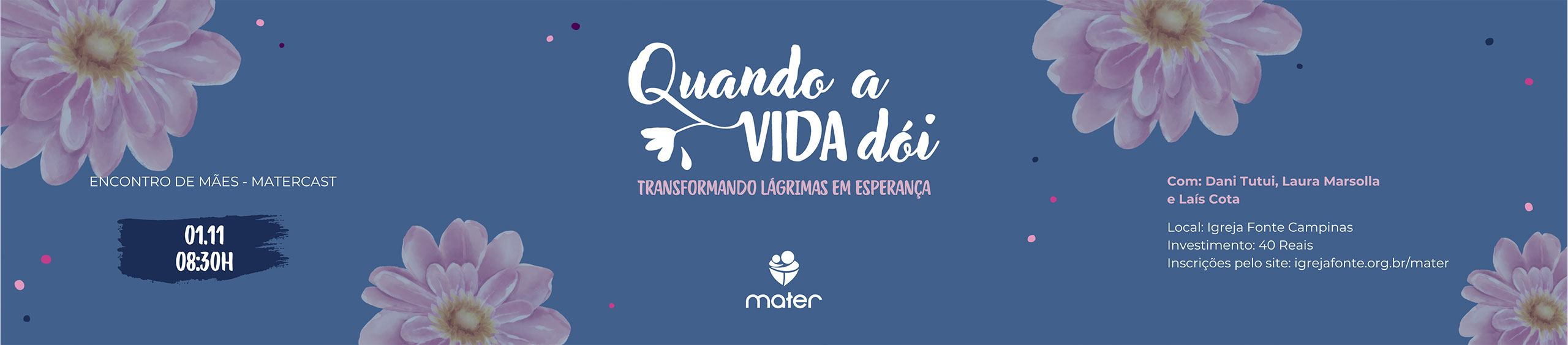 No dia 01/11, teremos um evento muito especial, o MaterCast, com algumas convidadas queridas (Dani Tutui, Laura Marsolla e Laís Cota), onde teremos o privilégio de ouvir suas experiências com Deus em meio aos seus vales e as lições preciosas que aprenderam.